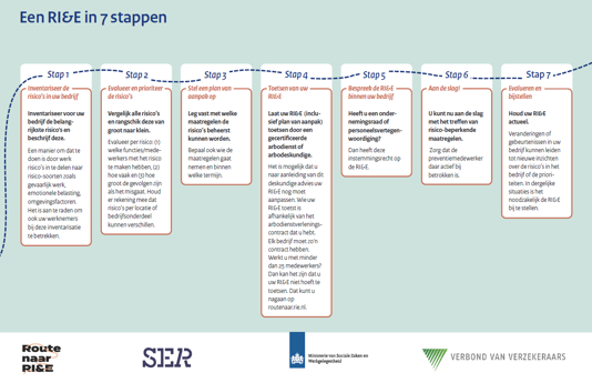 Naast een korte algemene toelichting, bevat de flyer zeven stappen voor het opstellen van een RI&E, van inventarisatie en toetsing door een deskundige tot het treffen van risicobeperkende maatregelen.