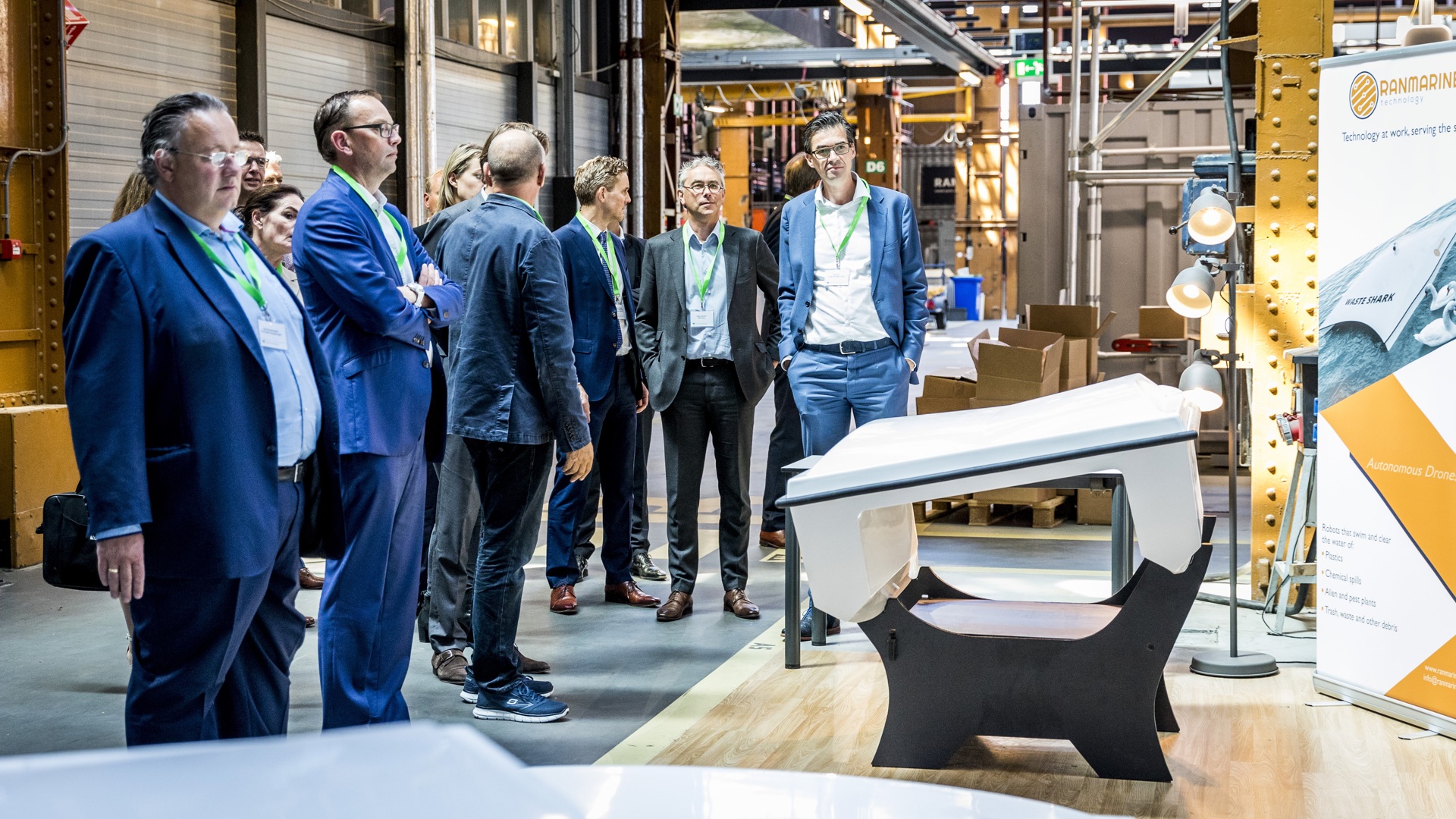 De Innovation Dock is een volledig open omgeving die uitnodigt om contact te maken met anderen. Blokdijk loodst de leden van het Verbond die deelnemen aan het event Nieuwe Wegen onder meer langs de zwemmende robot die afval verzamelt. “RanMarine Technology is een van de startups hier. De geschiedenis van het bedrijf begint in Afrika toen de initiatiefnemer mensen in een roeiboot plastic uit het water zag scheppen. Hij dacht: ‘dat moet een stuk makkelijker kunnen’ en is samen met een medewerker van de RDM aan het werk gezet. Dat heeft geleid tot de Waste Shark, een catamaran die in 24 uur maar liefst 500 ton afval kan verzamelen. De Waste Shark wordt inmiddels verkocht”, weet Blokdijk, “en is enorm belangrijk om de plastic soep aan te pakken. Maar liefst tachtig procent van die plastic soep wordt in en door de havens veroorzaakt.”