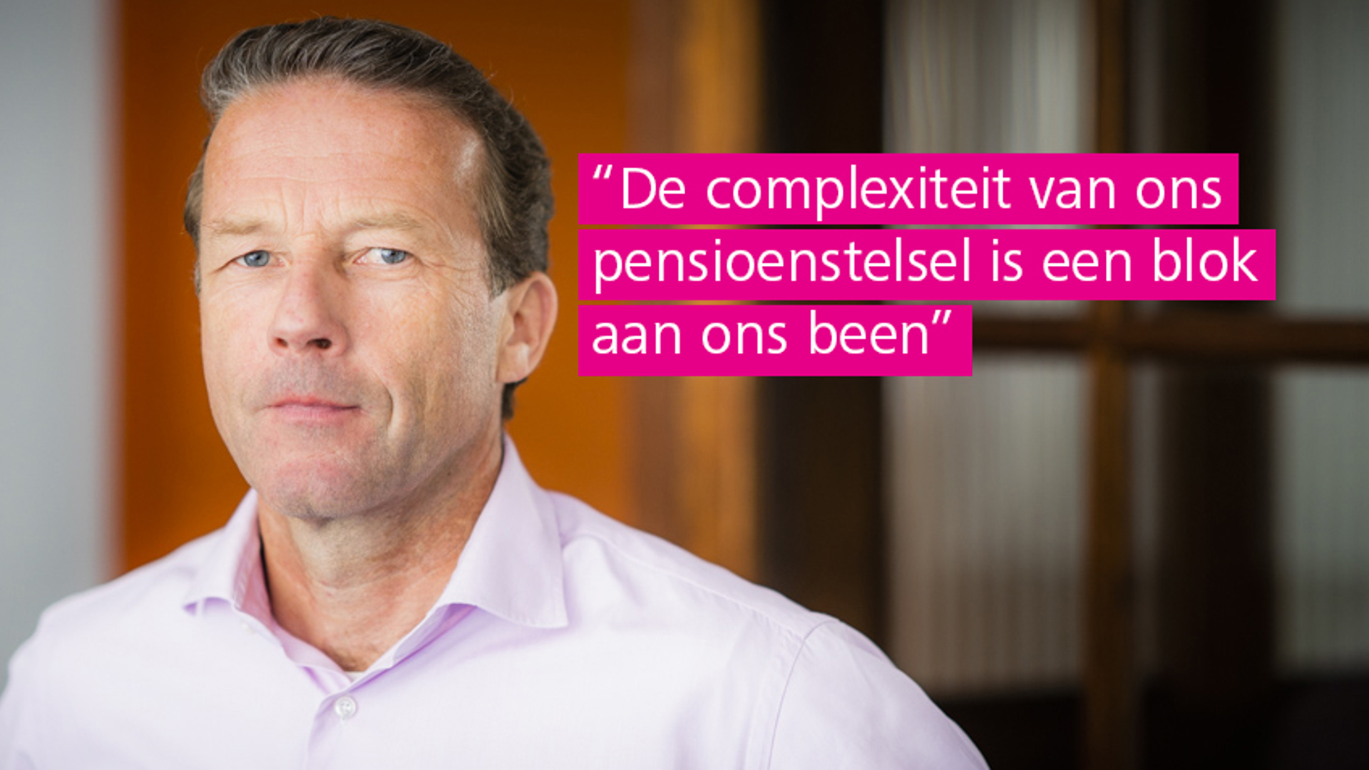 “Tja, wat is fout? Er zit wel een bepaalde starheid, maar vanuit het verleden snap ik dat wel. We zitten in een overgangstermijn en moeten switchen van 50, 60, 70 jaar garanties naar meer flexibiliteit. Dat kost tijd. Als je mensen vriendelijk vraagt of ze het erg vinden een jaar langer door te werken, worden ze boos. En iedere keer als er iets verandert, bijvoorbeeld de rekenrente, wordt het systeem nog ingewikkelder gemaakt. De jongeren hebben totaal geen zicht op wat ze opbouwen en vertrouwen het systeem allang niet meer. Ook de ouderen zijn argwanend en denken dat hun geld wordt afgepikt. Iedereen is boos. Dat is toch een raar systeem als je de rijkste pensioenspaarder van de wereld bent? En dat komt doordat we het veel te ingewikkeld hebben gemaakt. Die complexiteit moet er uit.”